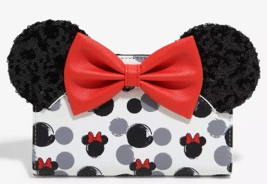 Our style icon, Minnie Mouse, approves of this accessory! This Loungefly snap wallet has an allover print of black and grey polka dots and Minnie Mouse's head silhouette. It is topped with 3D sequined ears and a faux leather red bow. The back has a zippered pocket, and the inside has card and cash slots, plus clear ID display.