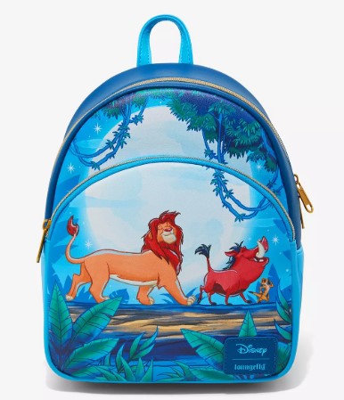 Hakuna matata is truly a philosophy to live by! This mini backpack captures the musical scene where Simba, Timon and Pumbaa are singing the iconic song from The Lion King, against a full moon backdrop. It says "Hakuna Matata" with baby Simba on the back, and has a front zippered pocket and adjustable straps.